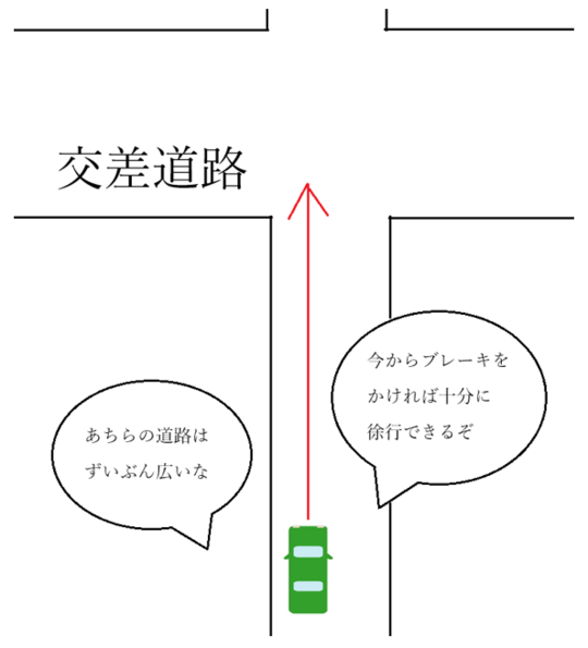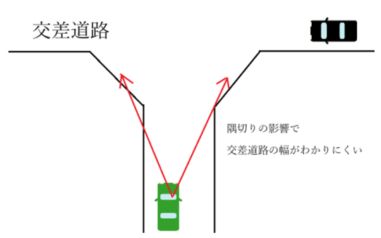 また、交差点に隅切りがある場合も、交差点入り口が広く開きますので、交差道路の広さがわかりにくくなる場合があります。