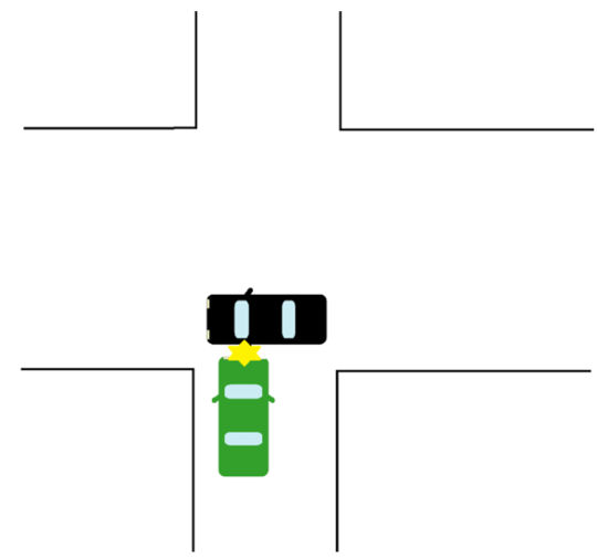 下記の交差点で、緑の車を運転していたドライバーの過失割合は40、黒い車の過失割合は60となります。左方優先の原則により、左方から来た緑の車が黒い車よりも優先されるのです。この記事では、いずれの車も速度はほぼ同じとします