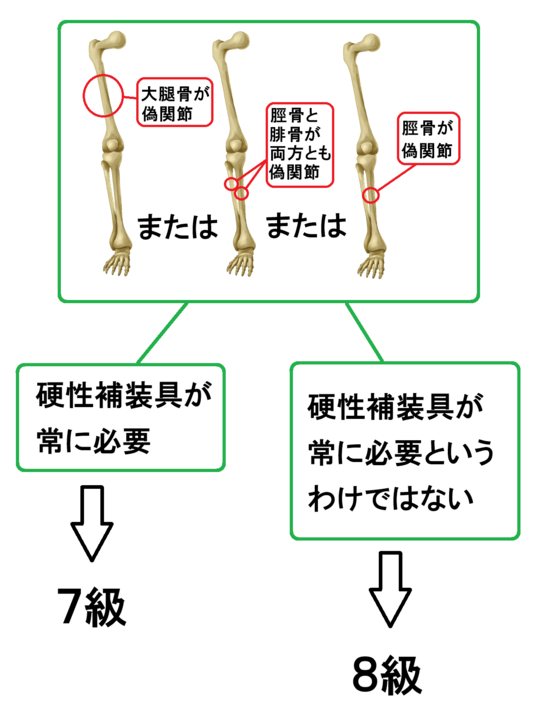 次の図のように、太ももの骨(大腿骨)や、ふくらはぎの骨(脛骨と腓骨の両方、あるいは脛骨のみ)が偽関節になった場合、7級か8級になります。