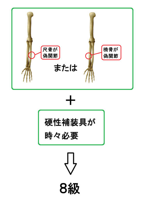 次の図のように、二の腕の骨には橈骨と尺骨がありますが、そのうち片方だけが偽関節になり、なおかつ、硬性補装具を時々使う必要がある場合には8級となります。