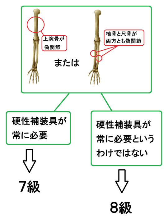 次の図のように、二の腕の骨(上腕骨)や、前腕の骨(頭骨と尺骨の両方)が偽関節になった場合、7級か8級になります。