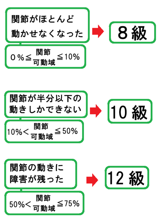 障害が残った関節の数や関節の可動の制限の程度に応じて後遺障害等級が決まります。
