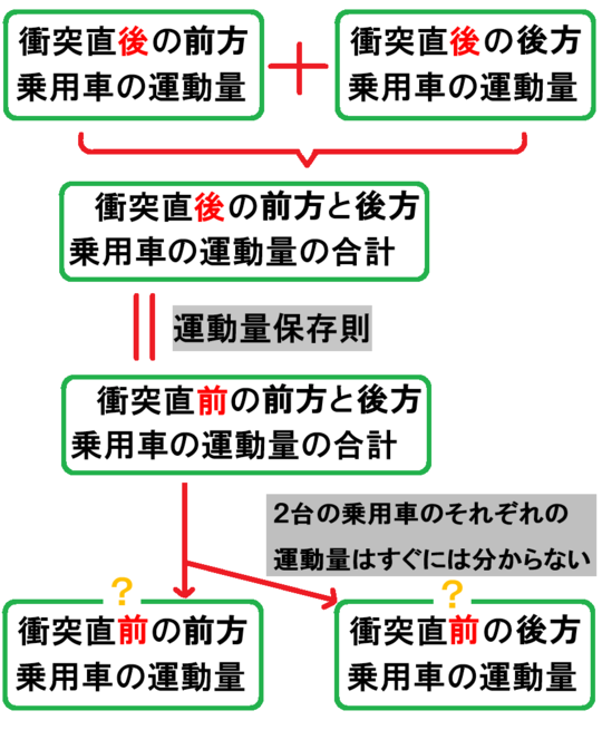 しがたって、運動量保存則を使って衝突直前の2台の運動量の合計までは分かっても、各乗用車の運動量がぞれぞれどれだけだったのか、簡単に出すことができません。