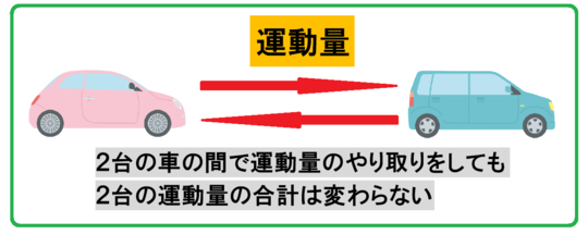 運動量保存則によると、2台の車が衝突によって運動量のやり取りをしても、2台の車の運動量の合計は変わりません。
