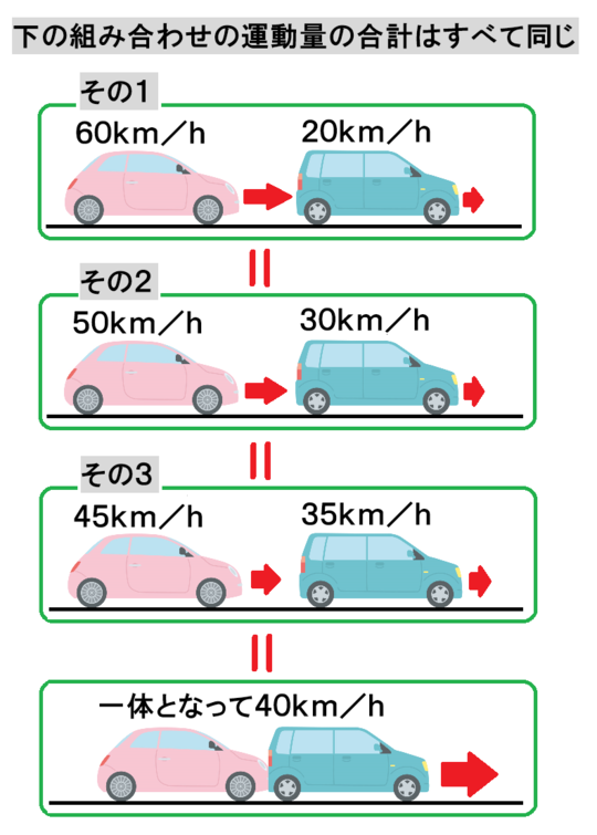 例えば、以下に2台の衝突前の速度の組み合わせの例を3つ挙げてみました。いずれの例でも、運動量保存則により、衝突後の2台の速度は時速40km/hとなります。