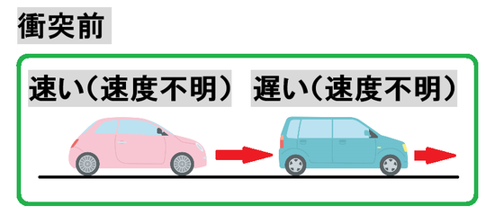 前の記事の場合には前方の車両が停止していたので「運動量=0」として後方車両の運動量が出せたのですが、今回は前方乗用車は走行しており、走行速度も不明です。