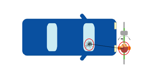 十字交差点で、自動車とバイクあるいは自転車が出合い頭衝突し、バイク(自転車)を跳ね飛ばしたような場合に、バイク(自転車)の乗員の頭部の移動方向を見ることで、自動車の速度を計算できる方法(正確には、自動車の速度とバイク・自転車の速度の比を求める方法)があります。