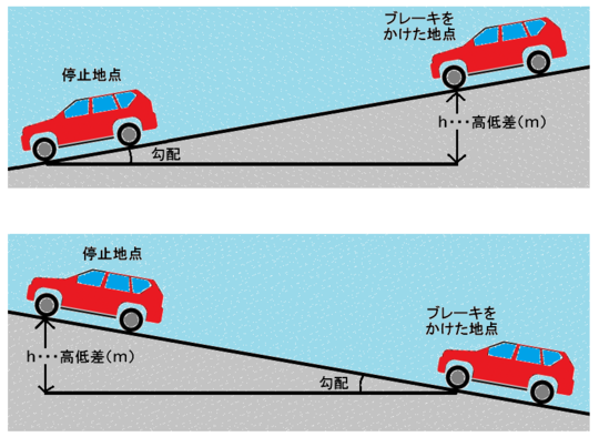 なお、ここでのh(高低差)とは、以下の図の通り、自動車がブレーキをかけ始めた地点と停止した地点の高低差のことを示しています。