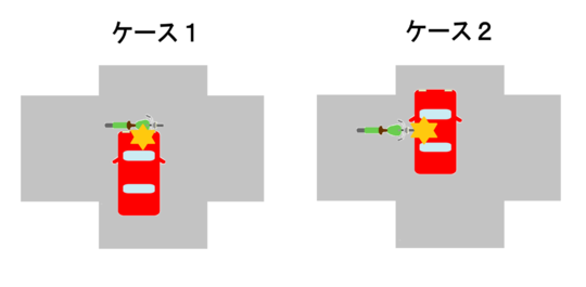 一見、自動車の方がバイクにぶつかっているケース1の方が、バイクが自動車にぶつけっているケース2の場合の方が、自動車の過失割合が増えるように見えますが、この2つのケースのどちらになるかで過失割合は基本的には変わりません。