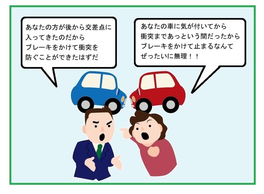 もっとも、衝突された側は、自分が衝突させたのではなく、相手が自分に衝突したことに強くこだわる傾向があります。衝突された側からすれば、「自分の方が先に交差点に入ったのだから、後から入った相手が『ブレーキを掛ける』とか『ハンドル操作で衝突を避ける』などの回避行動をとってくれれば衝突事故は起きなかった」と考えてしまうのでしょう。しかし、そのように考えるのは誤りです。