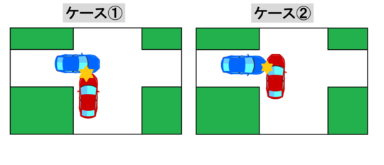 ケース①では青い車が衝突された側です。ケース②では赤い車が衝突された側です。衝突された側が、「自分の方が先に交差点に入った。自分は相手にぶつけられたのだ。自分は悪くない」として、強い被害者意識を持つのです。