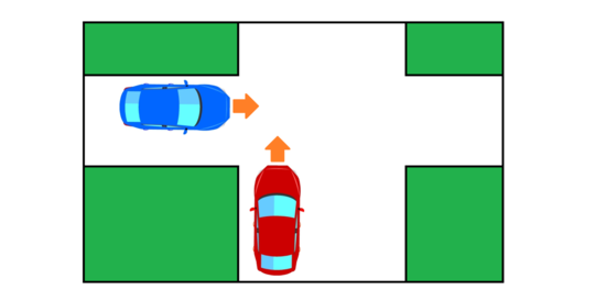 次の図のように、一方の道路が明らかに広い交差点で、狭い道路から出てきた青い車と、広い道路から出てきた赤い車が出会い頭に衝突する事故があったとします。交差点の見通しは良くなかったとします。信号機はありません。
