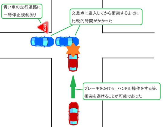 たとえば、先に交差点に入った車の速度がかなり遅かったため、衝突するまでに、後から入った車に衝突を避ける時間的な余裕がかなりあったような場合です。