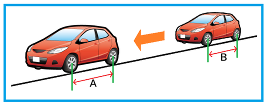 ホイールベースも、下記の図のように、自動車が防犯カメラの近くまで来たとき(A)と、防犯カメラから離れているとき(B)では、長さが異なります。Aの方がBよりも長くなります。