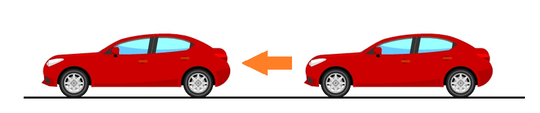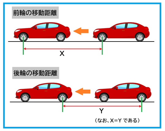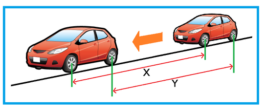 先ほどは前輪を基準にして移動距離を測っても(X)、後輪を基準にして移動距離を測っても(Y)、同じ長さになると言いました。しかし、下図のように遠近感が出ている場合には、そういうわけにはいきません。
