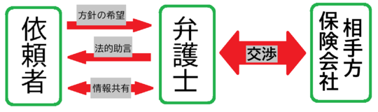 弁護士を入れるまでは、被害者ご本人が相手方の保険会社の担当者とやり取りをしますが、弁護士を入れると、弁護士が相手方とやり取りをすることになります。